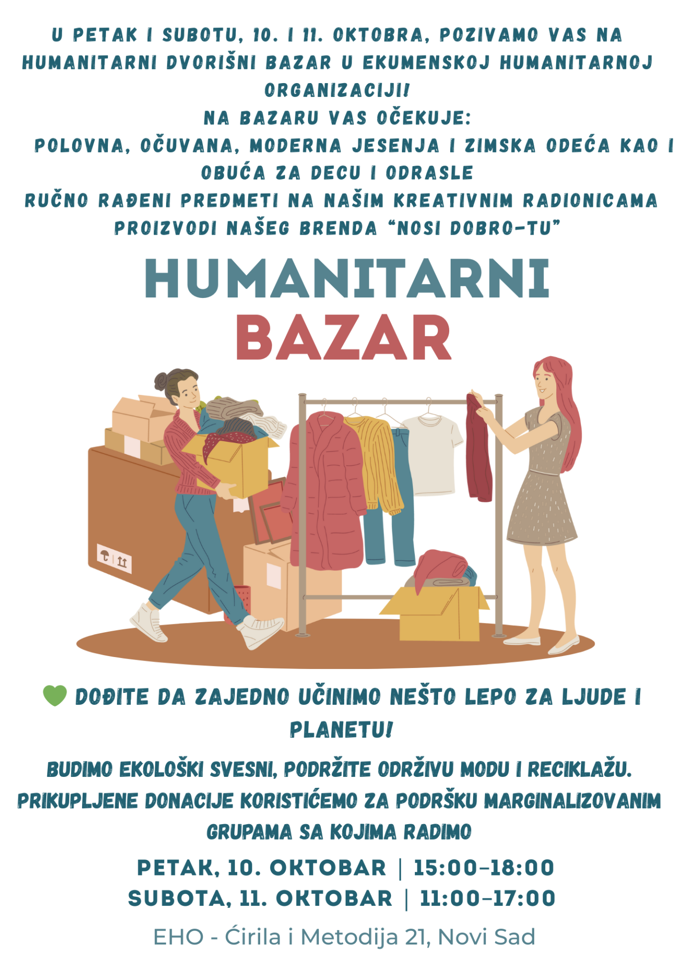 The Ecumenical Humanitarian Organization invites you to the Courtyard Humanitarian Bazaar, which will be held on October 10th and 11th, 2025, at our center at Ćirila i Metodija 21, Telep, Novi Sad.