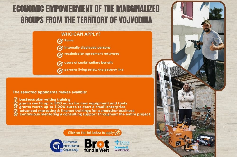 As part of the project "Education and economic empowerment of marginalized groups - continuation", the Ecumenical Humanitarian Organization (EHO) is announcing an open call for the support to the economic empowerment of vulnerable and marginalized groups in the territory of Vojvodina.